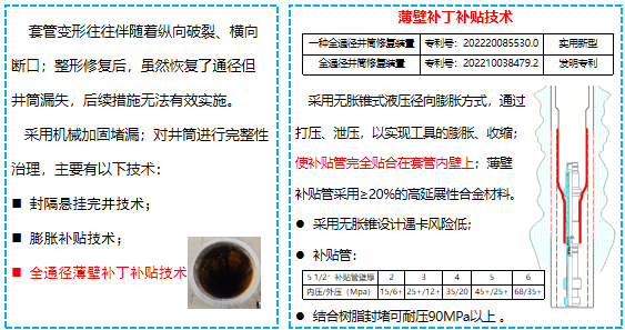 套管变形往往伴随着纵向破裂、横向断口;整形修复后,虽然恢复了通径但井筒漏失,后续措施无法有效实施。采用机械加固堵漏;对井筒进行完整性治理,主要有以下技术: